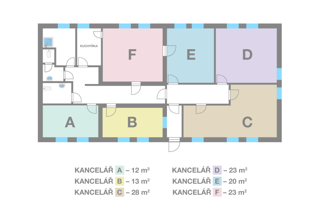V rámci nově koupeného areálu v Kovohutích máme k dispozici samostatnou kancelářskou budovu, kterou zatím sami nevyužijeme: 6 kanceláří, kuchyňku a sociální zařízení.