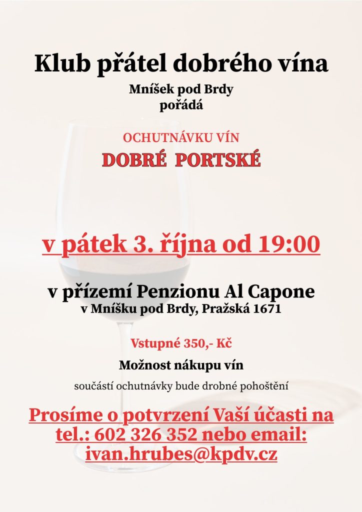 Mníšecký Klub přátel dobrého vína Káji Maříka, z. s. pořádá ochutnávku vín DOBRÉ PORTSKÉ, která se koná v pátek 3. října.