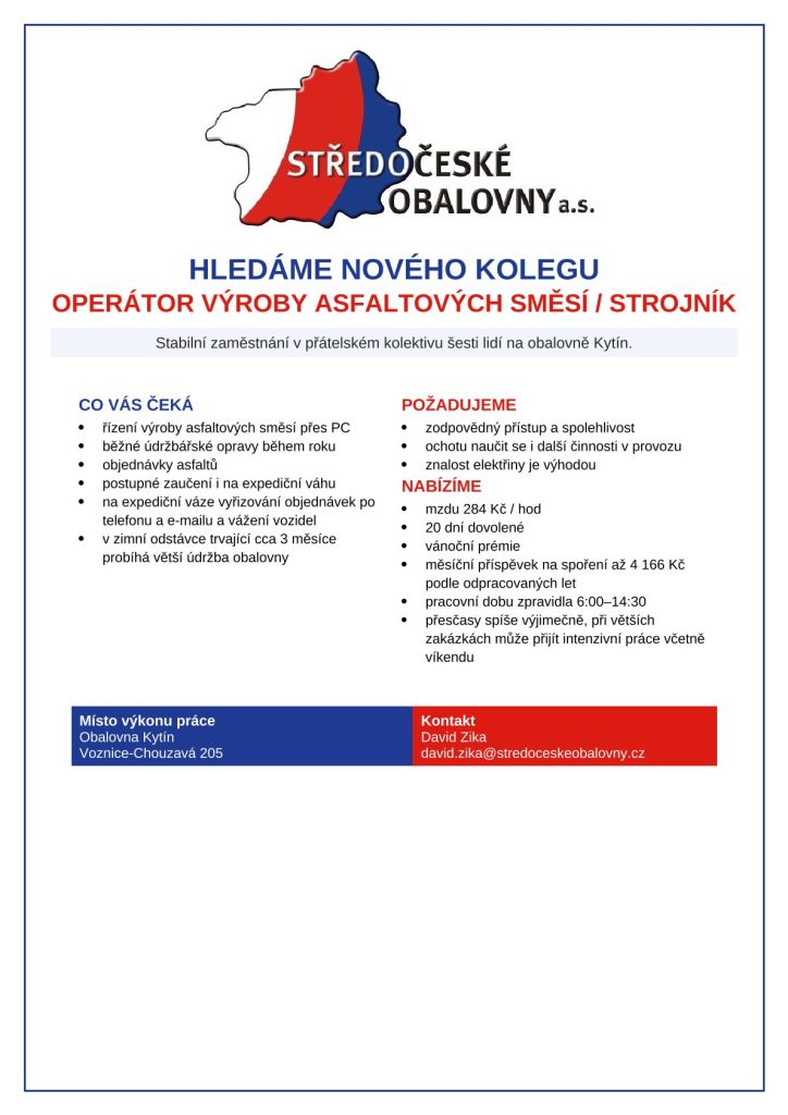 Jedná se o stabilní zaměstnání v přátelském kolektivu šesti lidí na obalovně Kytín.