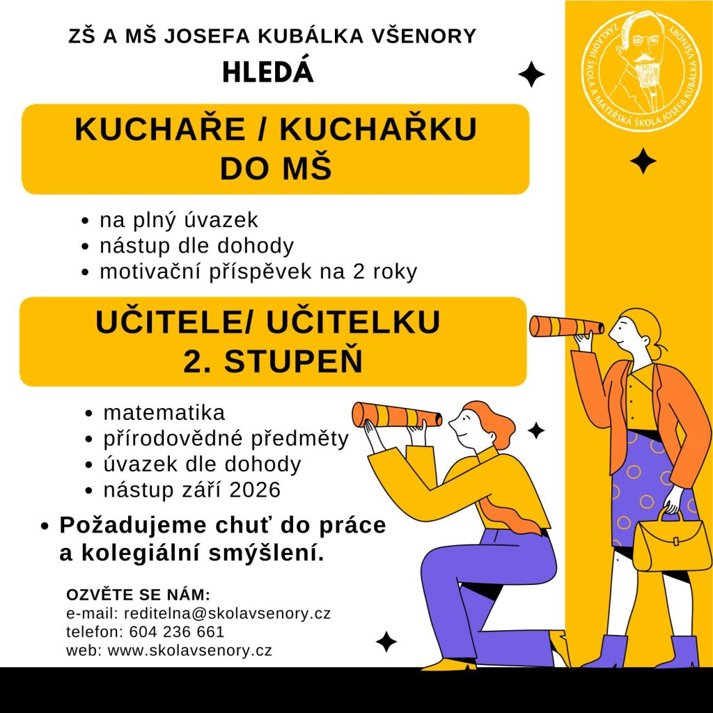 Základní a mateřská škola Josefa Kubálka Všenory hledá zaměstnance na pracovní pozice: