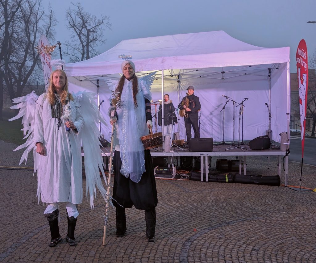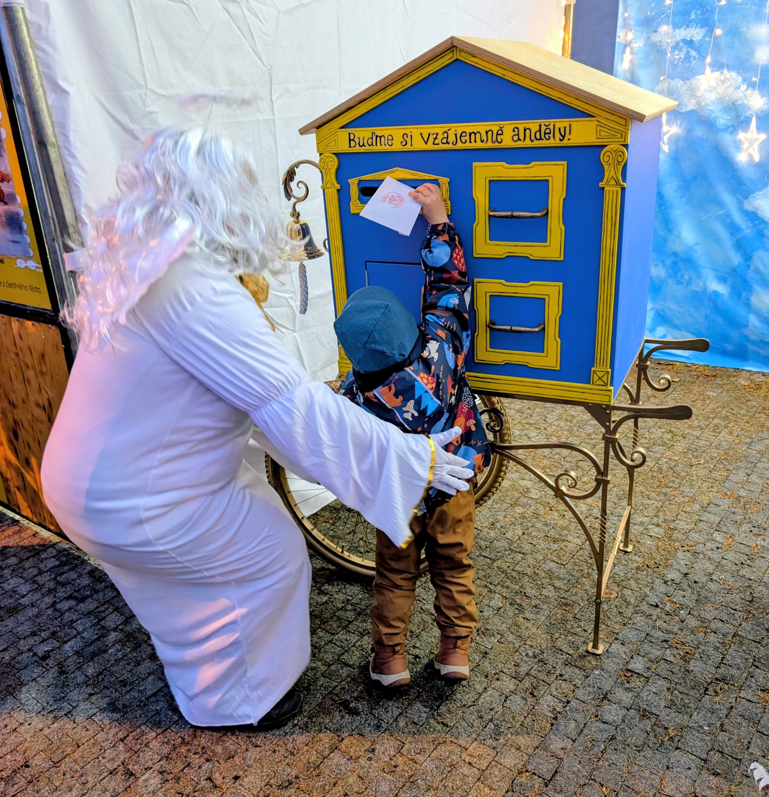 Čekání na rozsvícení vánočního stromu vyplnil tříhodinový kulturní program na Pěší zóně pod ohradní zdí kostela. Novinkou byla Andělská pošta se speciální poštovní schránkou, do které mohly děti vhodit své přání adresované Ježíškovi (na fotografii). Schránku obsluhovali dva andělé, kteří pomáhali i s psaním dopisů, z nichž každý orazítkovali. Malé i velké návštěvníky bavili další dva andělé na chůdách, které odměnili sladkou odměnou každého, kdo zarecitoval nebo zazpíval. Řemesla našich předků předváděli tři trhovci: kovář, svíčkař a výrobce vánočních ozdob, čtvrtý stánku se předváděly tradiční vánoční zvyky jako lití olova, rozkrajování jablíček a pouštění ořechových skořápek po vodě.