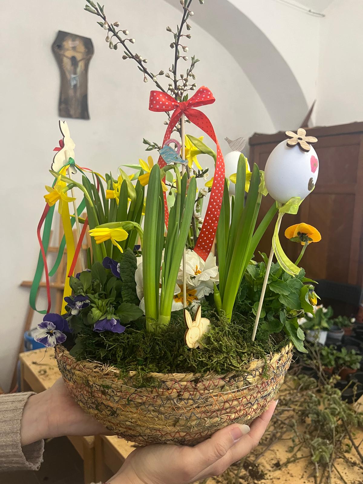 Při zdobení květináčů posloužily jarní květiny – sázely se například petrklíče, hyacinty, narcisy nebo macešky. Ty pak v květináčích doplnily přírodní mech a větvičky i drobné umělé přízdoby jako stužky, kraslice nebo zajíčci a kuřátka.