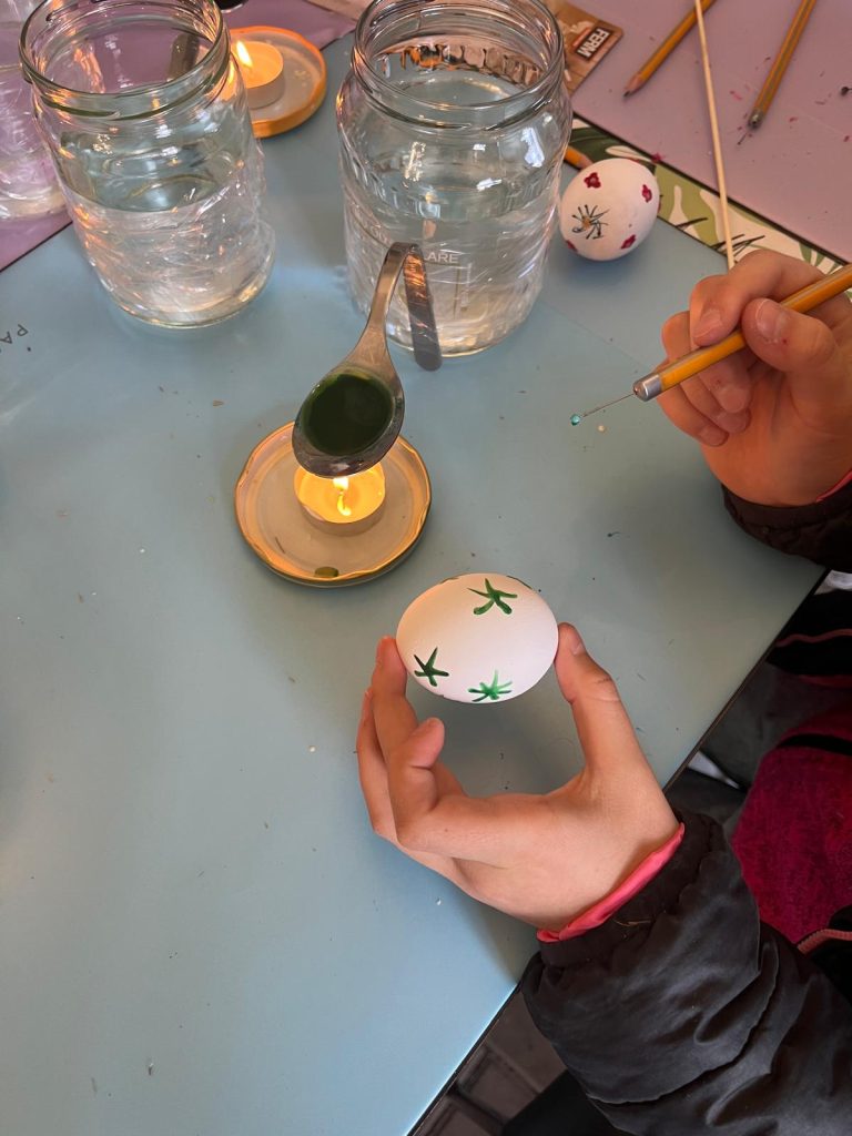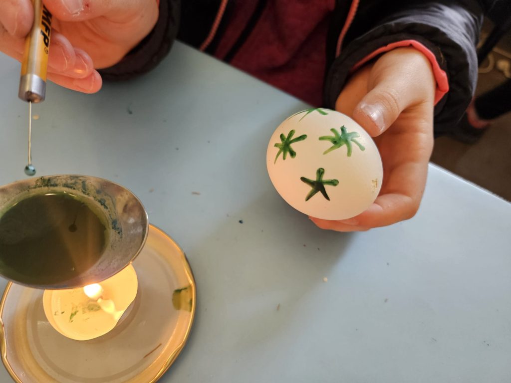 Kraslice se zdobily náročnou technikou madeira, kterou přítomným ukázala Hana Kotoučová. Do vyfouknutých vajíček se gravírovacím perem vytvořily drobné otvory a skořápky se potom ještě dozdobily rozehřátým obarveným včelím voskem.