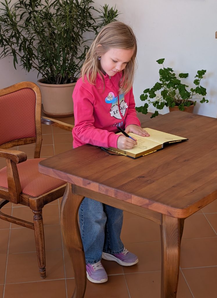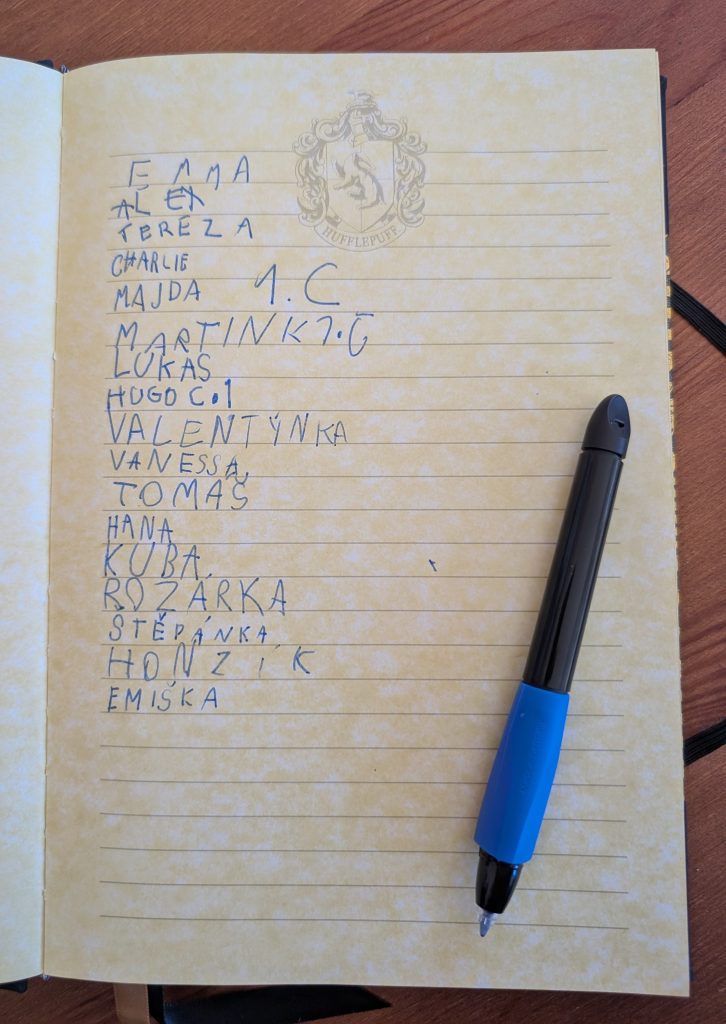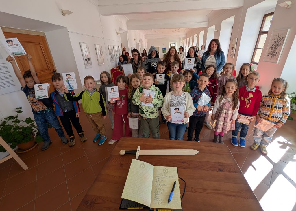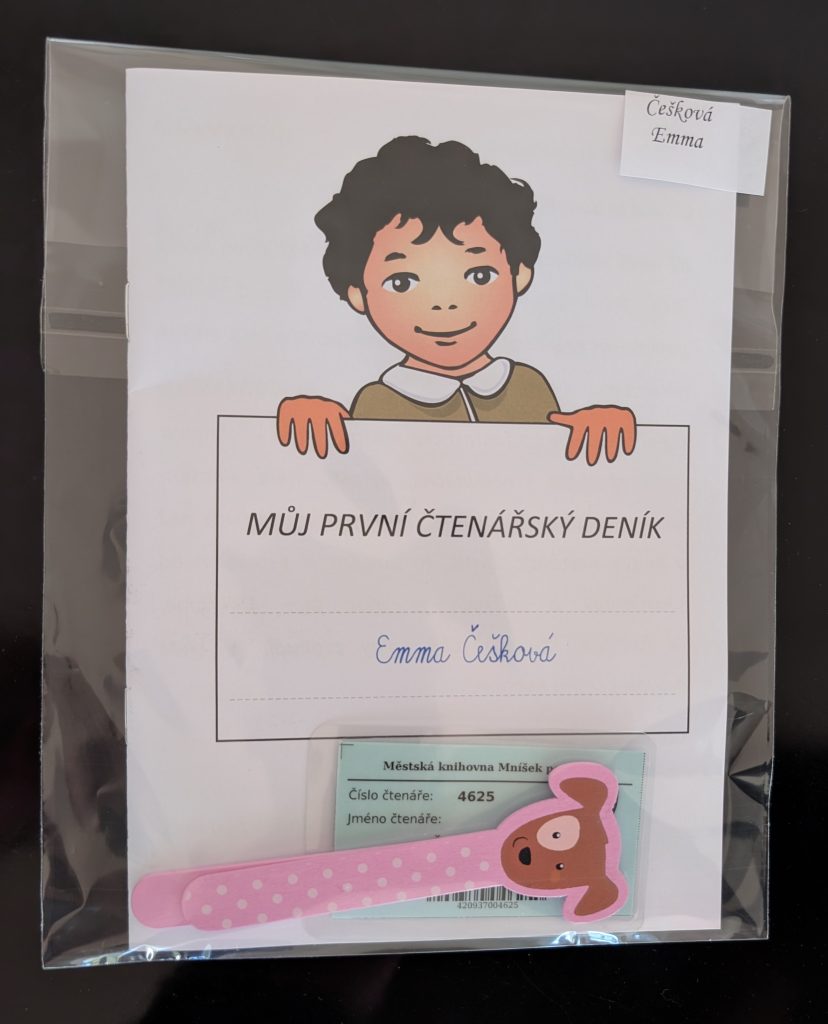 Potom každý nový čtenář napsal úhledně své jméno (stačilo křestní) do připravené Pamětní knihy. Následně přešel k rytíři, od kterého dostal dárkový balíček se čtenářským deníkem, záložkou a průkazkou do knihovny.