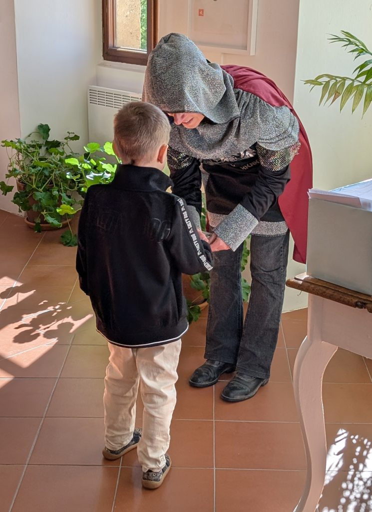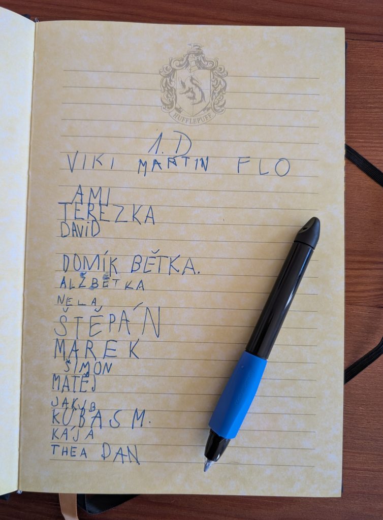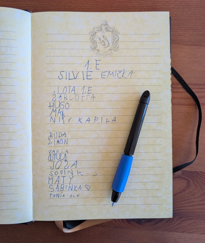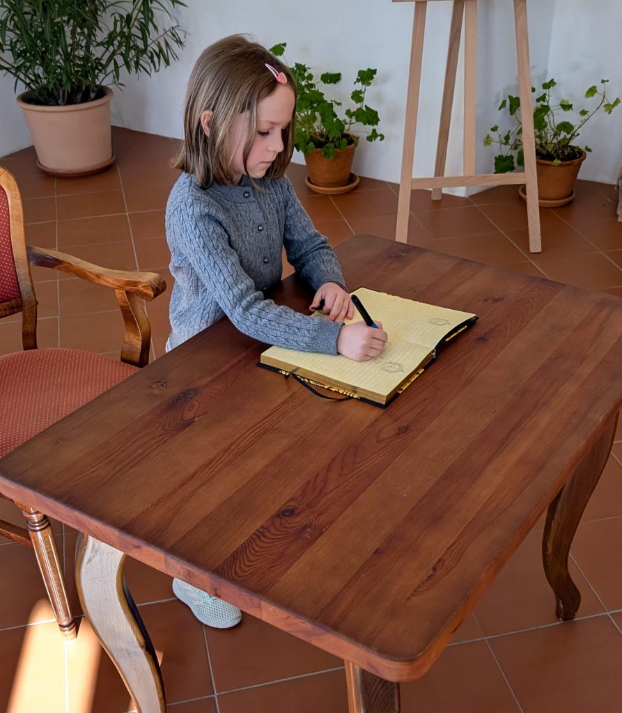 Potom každý nový čtenář napsal úhledně své jméno (stačilo křestní) do připravené Pamětní knihy. Následně přešel k rytíři, od kterého dostal dárkový balíček se čtenářským deníkem, záložkou a průkazkou do knihovny.