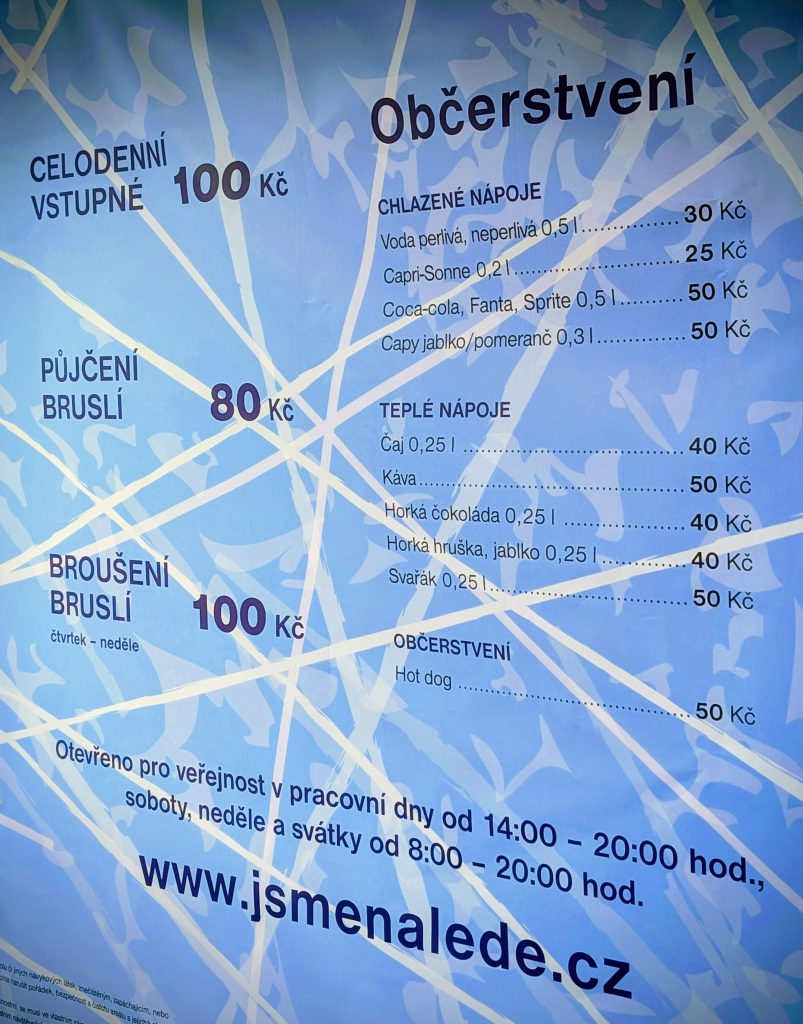 Kluziště je otevřeno denně od 8:00 do 20:00.