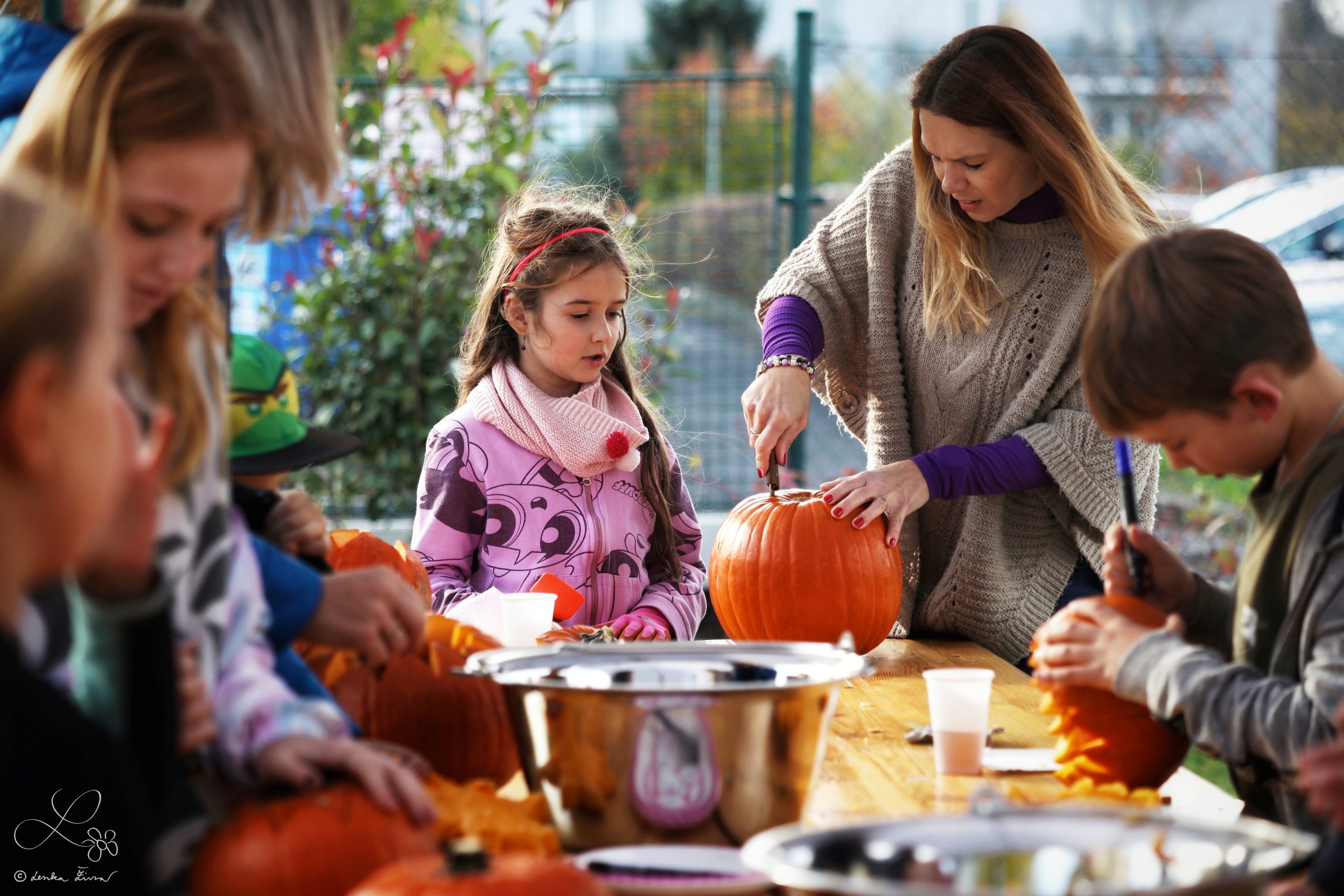 Pod párty stany si mohli vydlabat dýni a vyrobit hrůzostrašného dýňáka, který jim bude dělat radost doma na zahradě nebo za oknem. V altánu měli možnost dotvořit si barvami, strašidly vystříhanými z papíru nebo listím skleněnou oranžovou lucerničku, která jim pak po soumraku posvítila na cestu domů. Obličej jim šikovná malířka „zkrášlila“ na přání nějakým strašidelným motivem: pavučinou s pavoukem i bez něj, duchem, jizvou, lebkou nebo potměšilým klaunem.