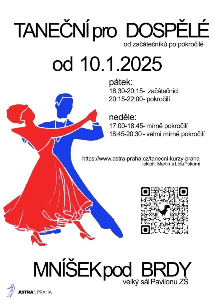 Již šestým rokem probíhá v Pavilonu u Základní školy Komenského 420 výuka tance pro dospělé pod hlavičkou Taneční školy Astra Praha. Začíná se od pátku 10. ledna 2025.