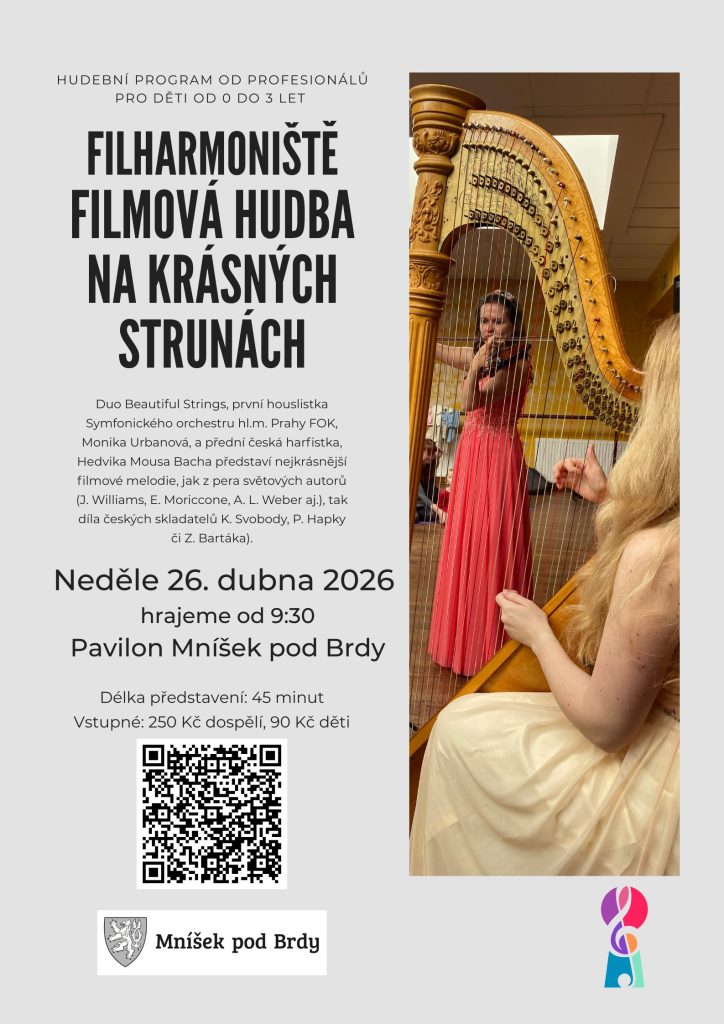 Duo Beautiful Strings, první houslistka Symfonického orchestru hl. m. Prahy FOK, Monika Urbanová, a přední česká harfistka, Hedvika Mousa Bacha představí nejkrásnější filmové melodie, jak z pera světových autorů (J. Williams, E. Moriccone, A. L. Weber aj.), tak díla českých skladatelů K. Svobody, P. Hapky či Z. Bartáka).