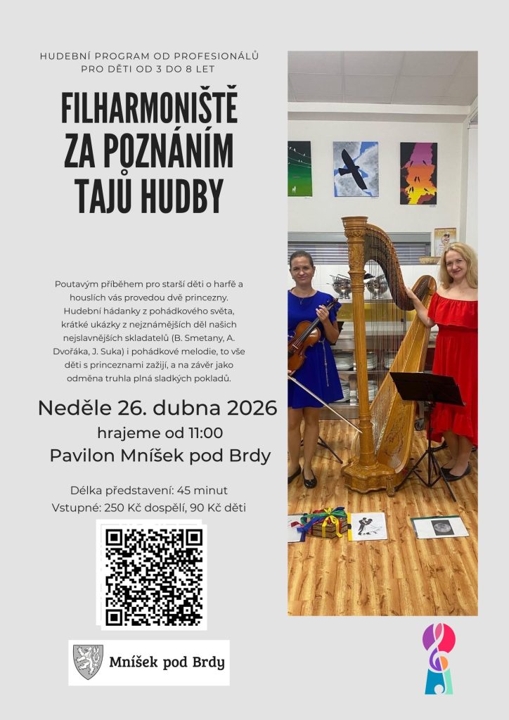 Poutavým příběhem pro starší děti o harfě a houslích vás provedou dvě princezny. Hudební hádanky z pohádkového světa, krátké ukázky z nejznámějších děl našich nejslavnějších skladatelů (B. Smetany, A. Dvořáka, J. Suka) i pohádkové melodie, to vše děti s princeznami zažijí, a na závěr jako odměna truhla plná sladkých pokladů.