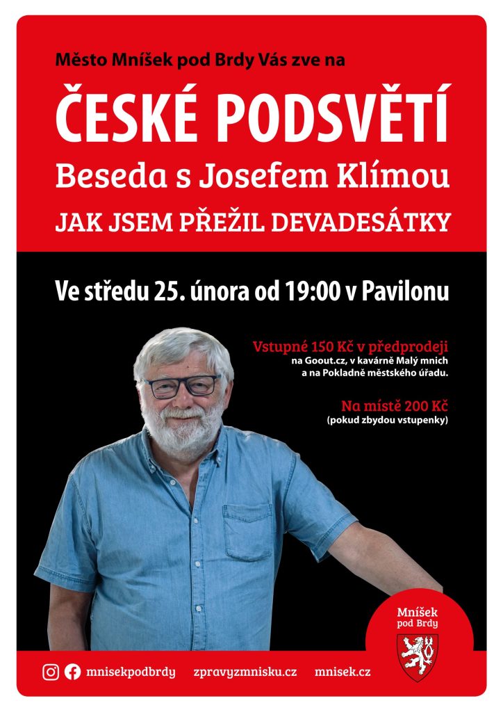 Ve středu 25. února se ve velkém sálu Pavilonu koná od 19:00 beseda s novinářem a spisovatelem JOSEF KLÍMOU.