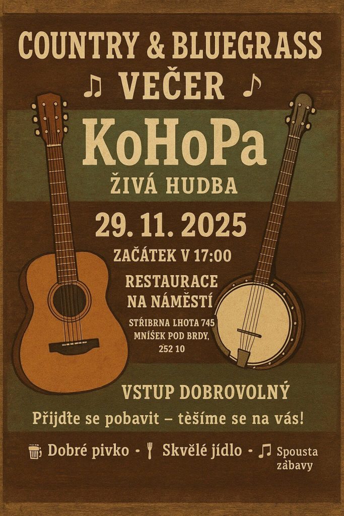 V sobotu 29. listopadu se v Hospodě ve Stříbrné Lhotě koná od 17:00 country a bluegrassový koncert kapely KoHoPa (Kolouch, Honzík, Pálka).