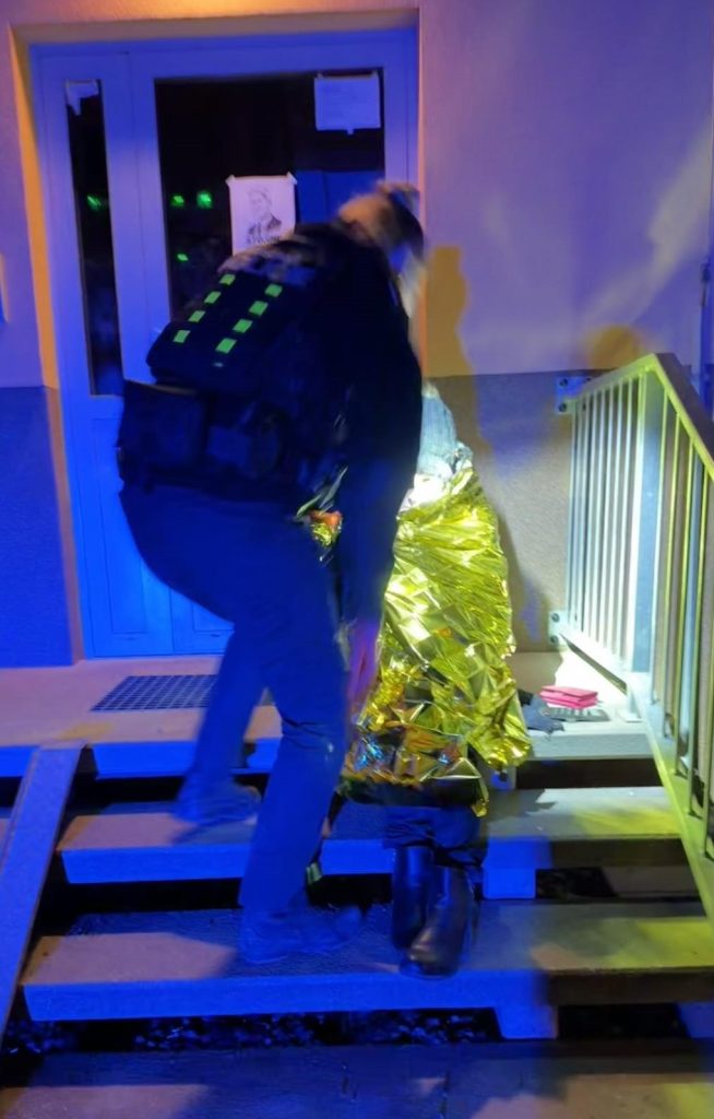 Týž den kolem 20. hodiny přijala noční hlídka oznámení o ženě sedící na schodech, která se zdála být v nepořádku. Po příjezdu zjistila, že si žena stěžuje na velkou zimu. Strážníci ji proto zabalili do izotermické fólie a začali zjišťovat okolnosti jejího pobytu venku. Následně se ukázalo, že jde o stejnou ženu, kterou řešila hlídka již odpoledne v pekárně. Tentokrát měla v dechu už více než 2,7 promile alkoholu, kterým se posílila krátce po propuštění z nemocnice. Vzhledem k jejímu stavu a následnému chování byla žena převezena na protialkoholní záchytnou stanici.