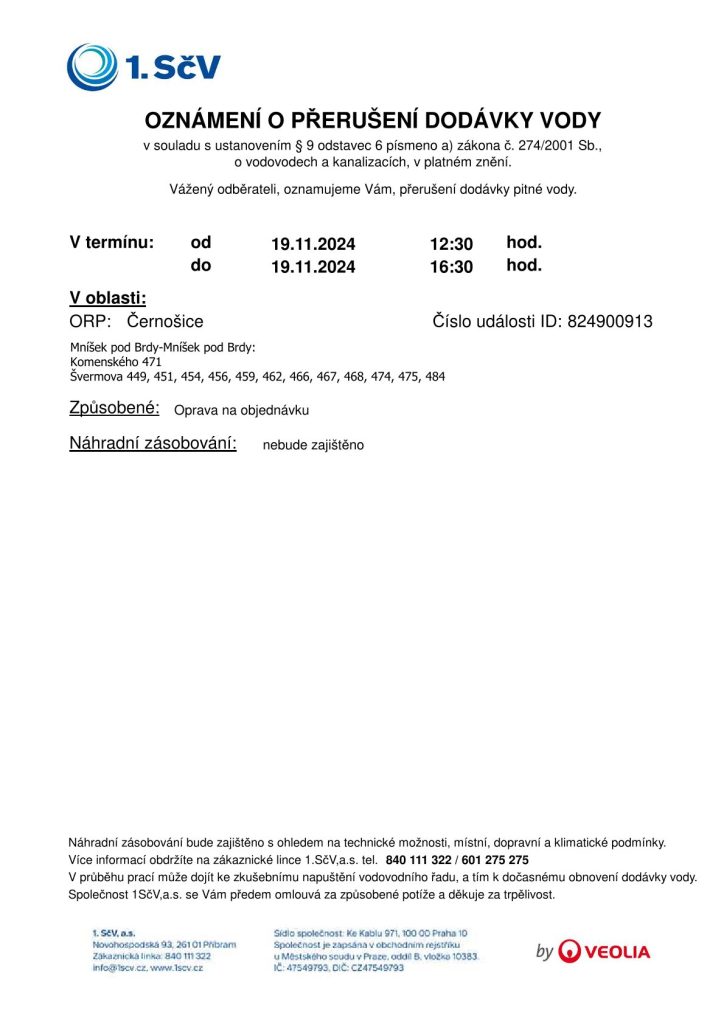 Společnost 1. SčV oznamuje, že v úterý 19. listopadu je přerušena dodávka vody od 12:30 do 16:30.