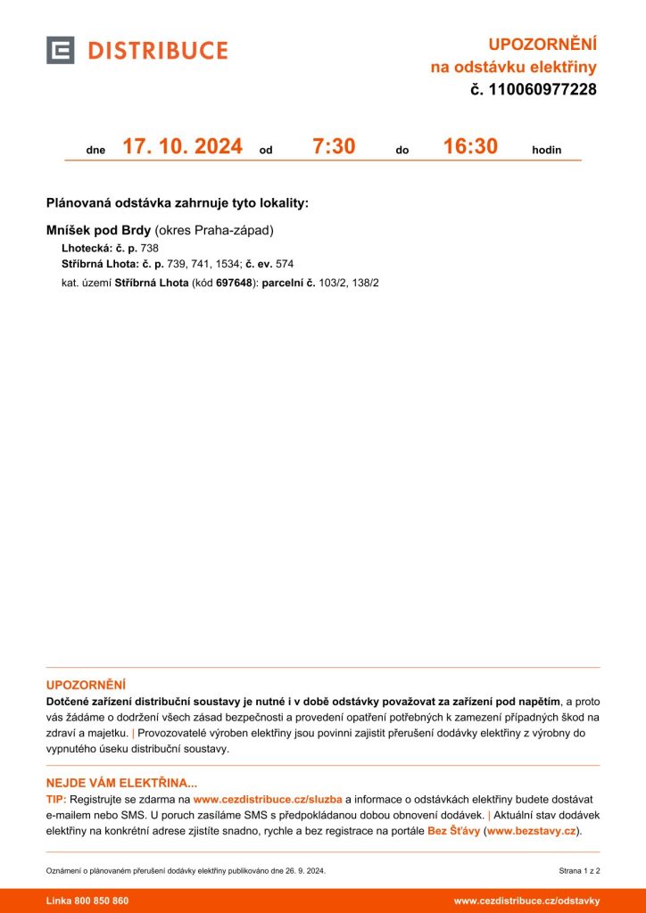 Ve čtvrtek 17. října dojde mezi 7:30 a 16:30 k plánované odstávce elektrické energie.