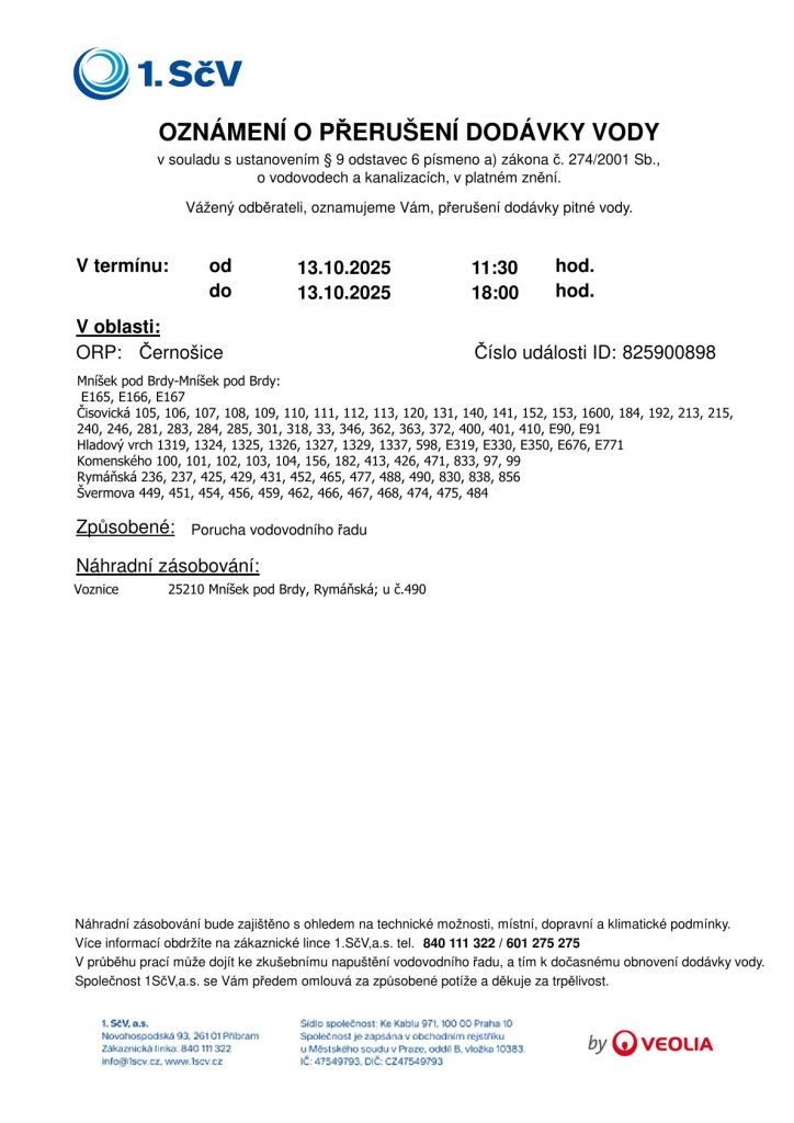 V pondělí 13. října dojde k přerušení dodávky vody v době od 11:30 do 18:00.