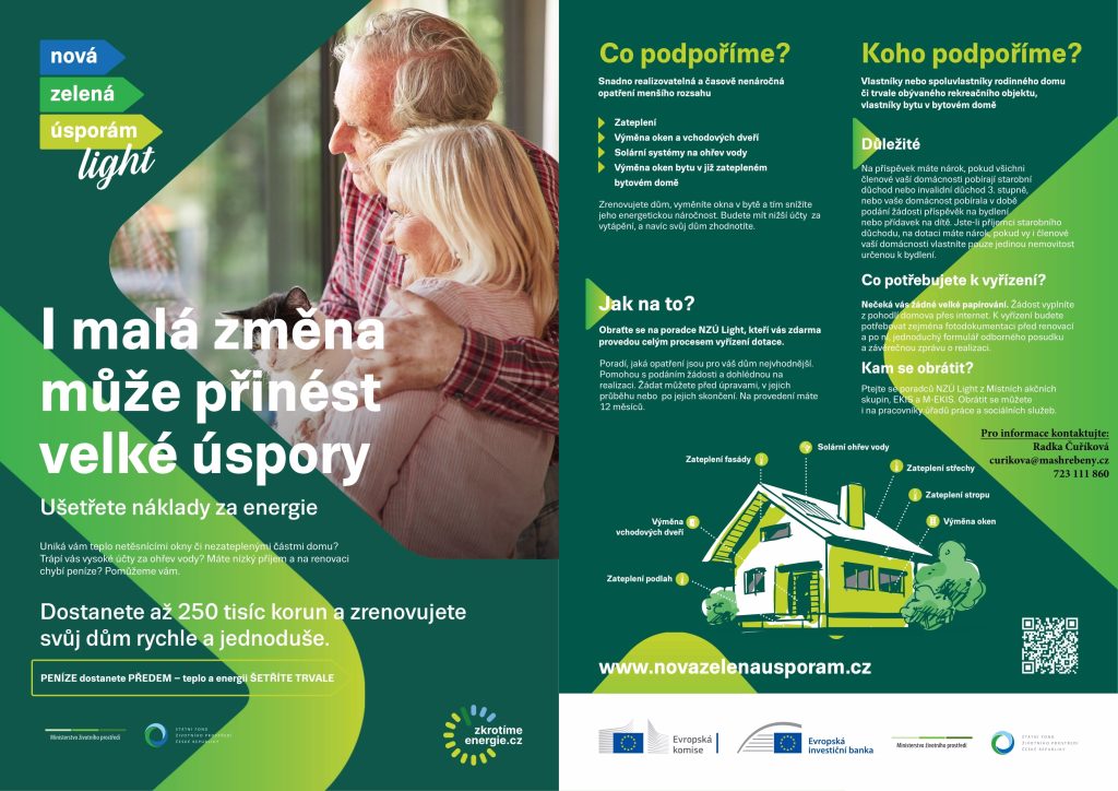 Obraťte se na Mgr. Radku Čuříkovou (MAS Hřebeny z. s.), která zájemcům poradí s celým procesem od podání žádosti až po doložení realizace úsporných opatření.