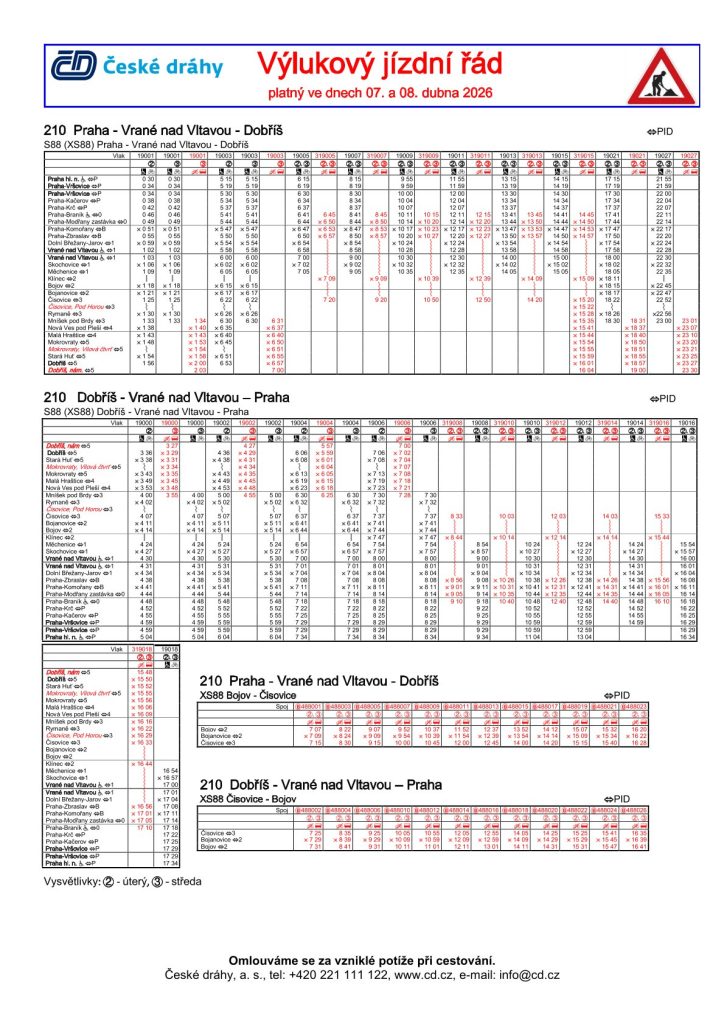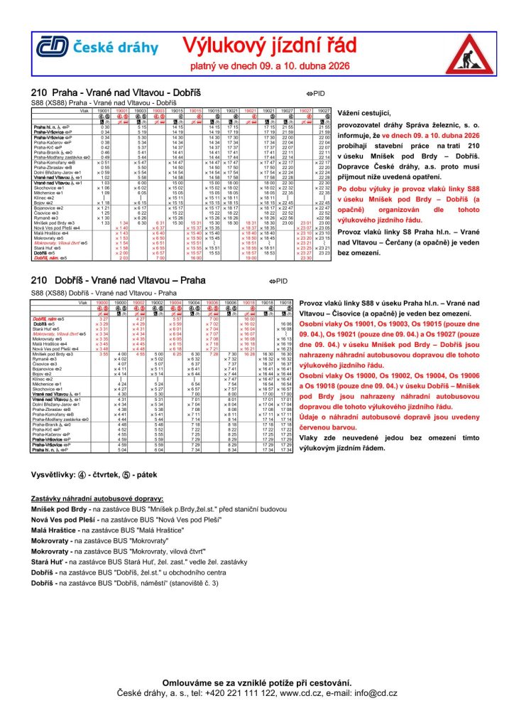 • Ve dnech 7. a 10. dubna bude nepřetržitá výluka z důvodu stavebních prací v úseku Mníšek pod Brdy – Dobříš.