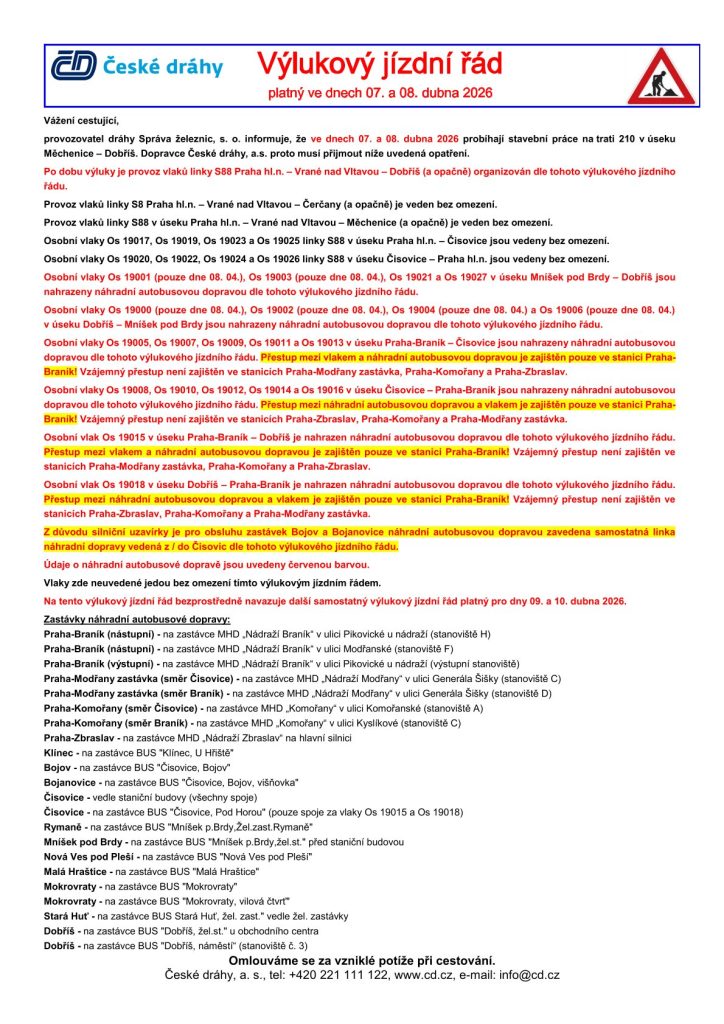• Ve dnech 7. a 8. dubna proběhne denní výluka z důvodu stavebních prací v úseku Měchenice – Dobříš.