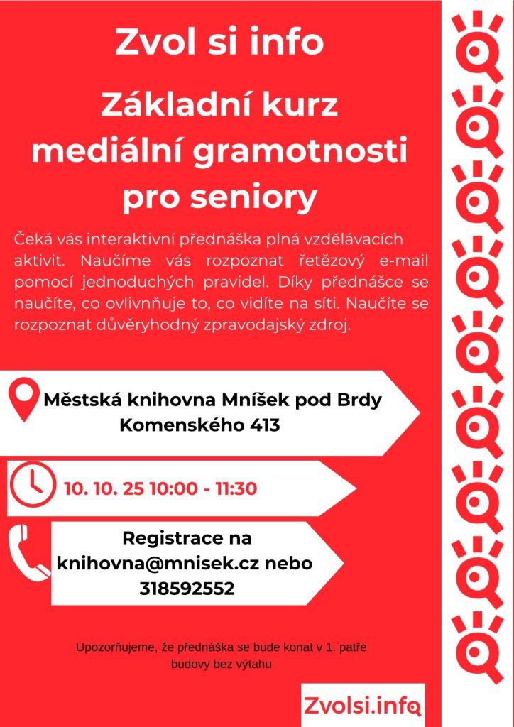 V pátek 10. října se v mníšecké knihovně (Komenského 413) koná Základní kurz mediální gramotnosti pro seniory.