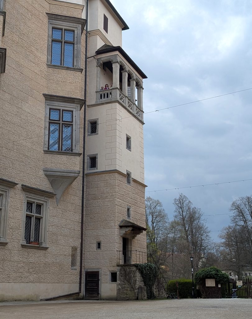 Po obědě jsme přejeli na zámek Blatná, který v sobě nezapře přestavěný středověký hrad, kdy nás po celou dobu prohlídky provázelo nepříjemné chladno. Jeho dřívější majitelé z rodu pánů z Rožmitálu významně zasahovali i do českých dějin přelomu 15. a 16. století. Z jejich rodu měl manželku král Jiří z Poděbrad, jeho švagr Jaroslav Lev z Rožmitálu vedl mírové poselstvo po západní Evropě a jeho synovec Zdeněk Lev z Rožmitálu byl po králích z rodu Jagellonců nejvýše postaveným šlechticem v Čechách. Od roku 1792 je Blatná v držení baronského rodu Hildprandtů z Ottenhausen. Zajímavé je, že v době 2. světové války zůstali věrni Československé republice, což je sice zachránilo přes takzvanými Benešovými dekrety, ale byli vystaveni komunistické zvůlí po roce 1948. Průvodkyně zmínila i filmovou historii zámku, protože se ti například natáčela Bílá paní (1965) nebo Šíleně smutná princezna (1968). Na odvážlivce pak čekalo stoupání po 78 schodech na západní terasu Rejtova paláce , odkud se pokochali výhledem do zámecké zahrady.