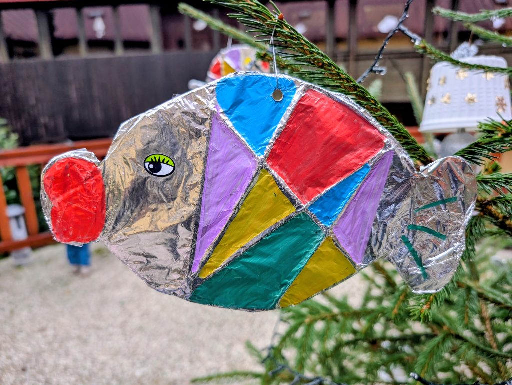 Děti vyrobily ozdoby i řetěz za pomoci tet z různých pestrobarevných materiálů., aby stromeček vypadal vesele.