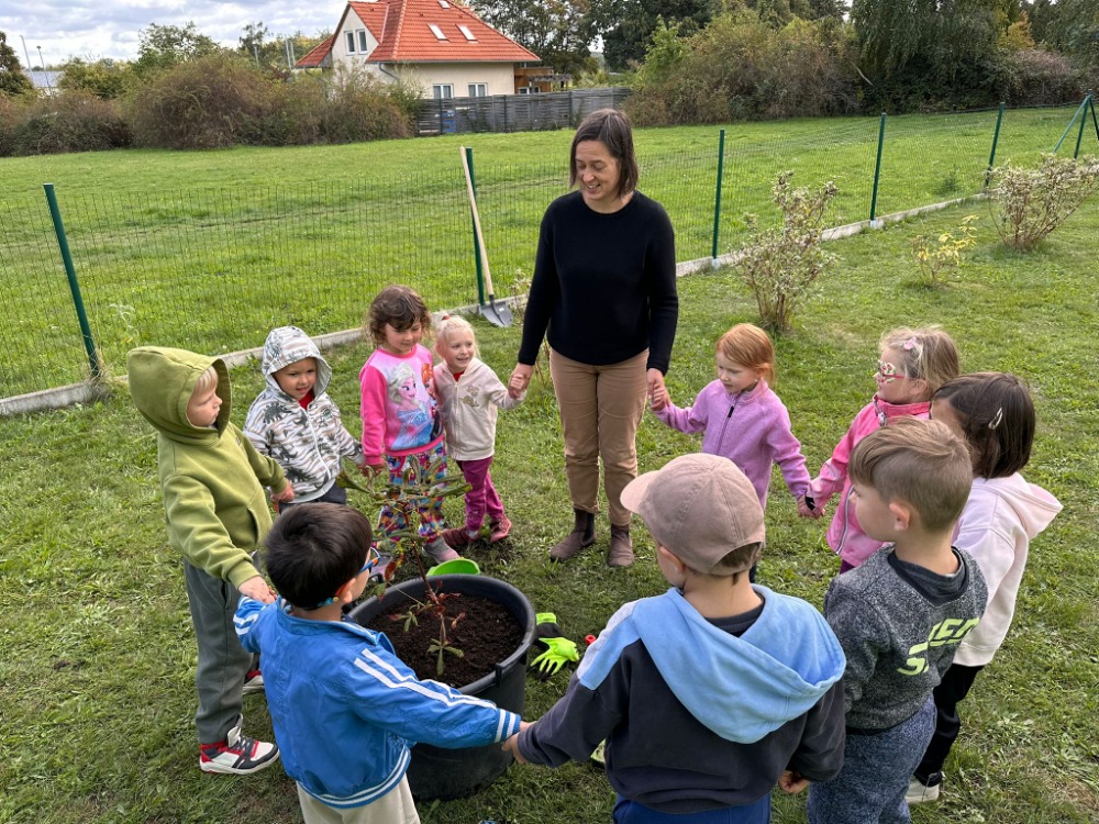 Prvním velkým úkolem v měsíci září bylo zasadit strom. Ne obyčejný, ale náš vlastní, který jsme vypěstovali z kaštanu – tedy jírovce maďalu. Kaštánek jsme si loni přinesli z jedné našich procházek a zasadili do záhonku, kde opravdu vyklíčil. Společně jsme jej přesadili do květináče a sledovali, jak se z něj stává malý stromek. Děti si vyzkoušely práci s hlínou, učily se, co strom potřebuje k životu, a domluvili jsme se, že o něj budeme společně pečovat.