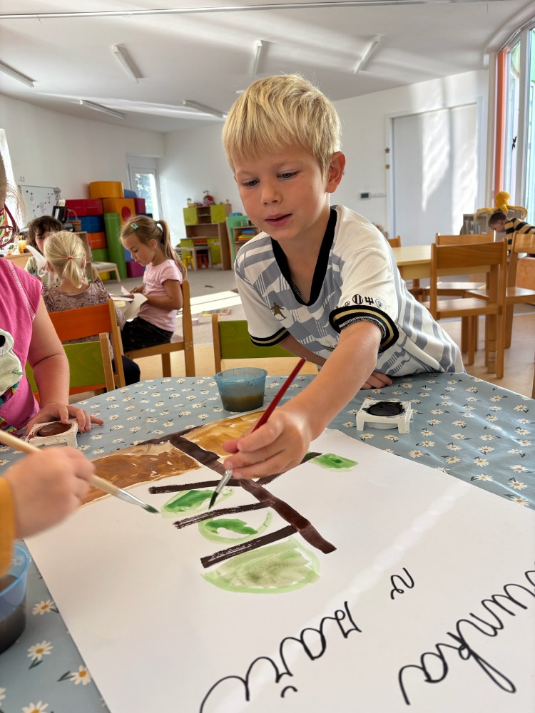 Jiná skupina se mezitím věnovala výtvarnému ztvárnění našeho malého stromku. Pomocí temperových barev malovaly děti obraz podle skutečné podoby, což jim pomohlo vnímat detaily, změny a růst.