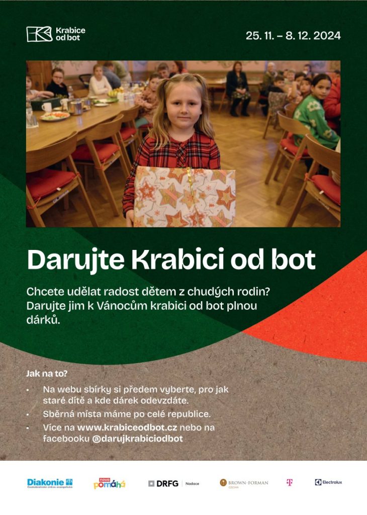 Milí příznivci akce Krabice od bot. Chtěla bych vám všem moc poděkovat za to, že i letos mi mnozí píšete, že už máte připravené krabice od bot a chystáte se je naplnit dárky pro děti, které žijí v sociálně vyloučených lokalitách nebo azylových domech a jsou postiženi chudobou. Děkuji, že učíte své děti solidaritě, věřte, že Váš dárek udělá velikou radost. V přepočtu na obyvatele naše město každoročně už 13 let za sebou vyhrává pomyslnou soutěž o nejvíce nasbíraných dárků v této předvánoční akci Diakonie Českobratrské církve evangelické.