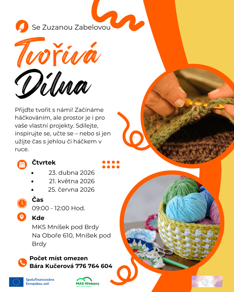 Tvořivá dílna se koná o čtvrtcích 23. dubna, 21. května a 25. června – pokaždé od 9:00 do 12:00.