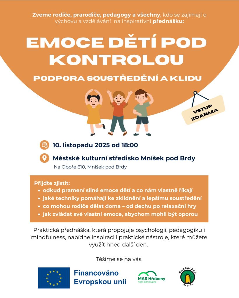 V pondělí 10. listopadu pořádá Magdaléna o. p. s. přednášku na téma EMOCE DĚTÍ POD KONTROLOU.