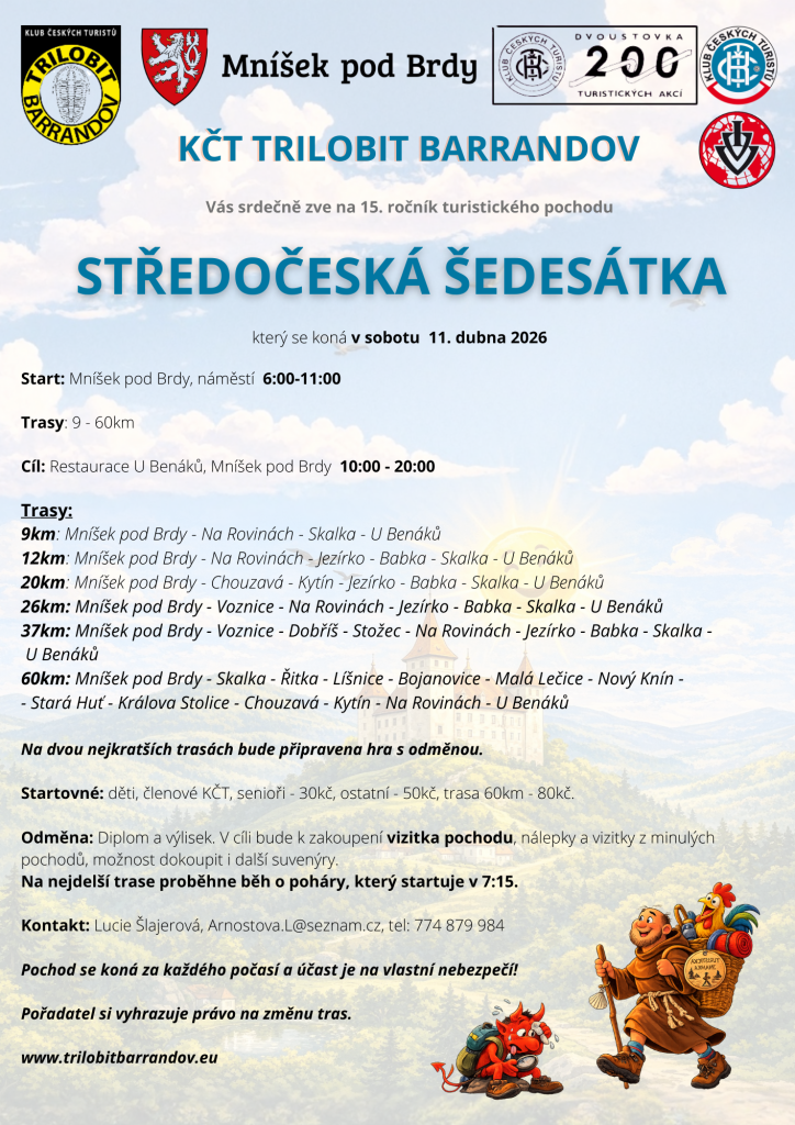 V sobotu 11. dubna pořádá Klub českých turistů Trilobit Barrandov pochod s názvem STŘEDOČESKÁ ŠEDESÁTKA.