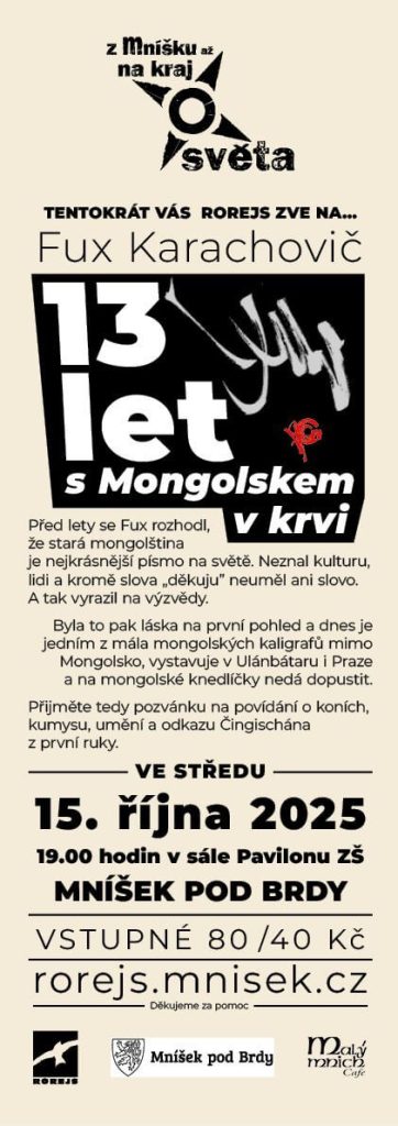Mníšecký spolek ROREJS zve na přednášku kaligrafa a cestovatele FUXE KARACHOVIČE s názvem „13 let s Mongolskem v krvi„.