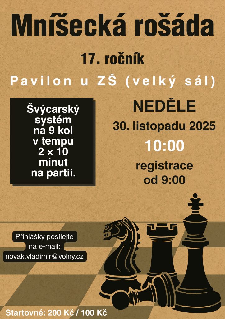 po roce se v neděli 30. listopadu 2025 uskuteční od 10 hodin ve velkém sálu Pavilonu ZŠ v Mníšku pod Brdy 17. ročník šachového turnaje Mníšecká rošáda.