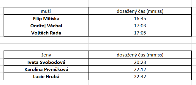Po vyslechnutí české státní hymny, odstartovala úderem druhé hodiny zároveň mužská i ženská kategorie. Dospělou trať zaběhl nejrychleji osmnáctiletý Filip Mitíska z Mníšku pod Brdy v čase 16 minut a 45 vteřin a obhájil prvenství z loňského ročníku (o dvě minuty byl rychlejší než loni). Mezi ženami byla nejrychlejší Iveta Svobodová z Čisovic s časem 20 ,minut a 23 vteřin. Všem malým i velkým běžcům gratulujeme!
