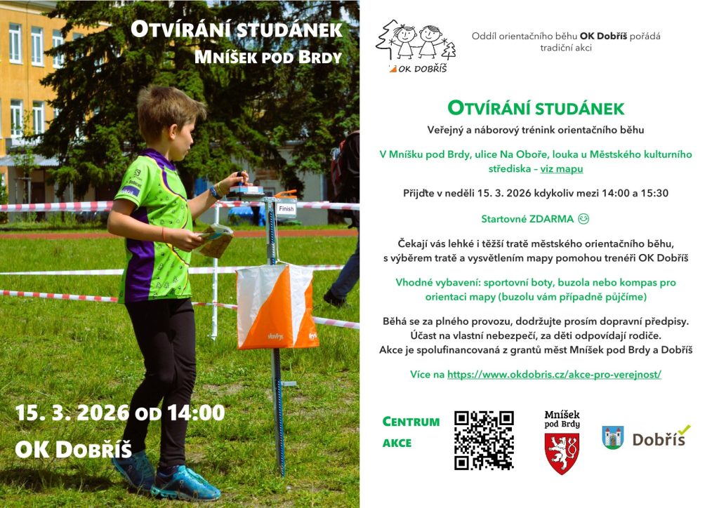 Zveme sportovní veřejnost v neděli 15. března mezi 14:00 a 15:30 na tradiční akci Otvírání studánek – veřejný a náborový trénink orientačního běhu, letos v Mníšku pod Brdy, s centrem na trávníku vedle budovy Městského kulturního střediska (Na Oboře 610).