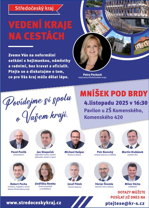 Od 16:30 proběhne v Pavilonu neformální setkání vedení Středočeského kraje s občany, na které je zvána veřejnost.