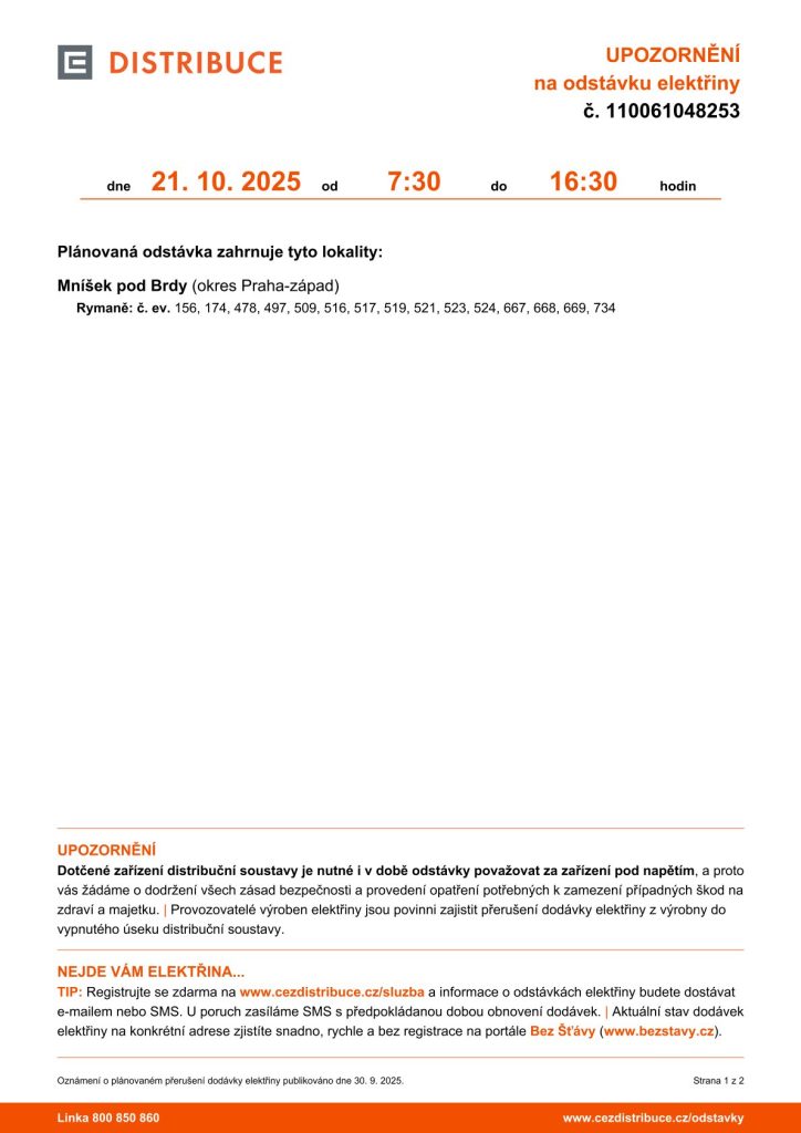 V úterý 21. října dojde k plánované odstávce elektrické energie od 7:30 do 16:30.