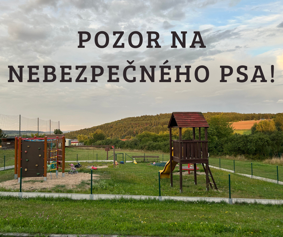 Dne 15. 8. 2024 u hřiště zaútočil agresivní pes na člověka a způsobil mu vážná zranění. Majitelka nebezpečného psa vůbec neovládá. Zvíře na zavolání neposlechne. Pes se většinou pohybuje bez vodítka, je černé barvy, střední velikosti a váží cca 20 kg. Majitelka spolu s ním venčí také další psy. Dbejte prosím zvýšené pozornosti a dávejte pozor především na děti, k incidentu došlo bohužel kousek od hřiště pro malé děti. Věc v tuto chvíli řeší Policie ČR. Vzhledem k probíhajícímu vyšetřování není možné poskytnout žádné detailní informace.