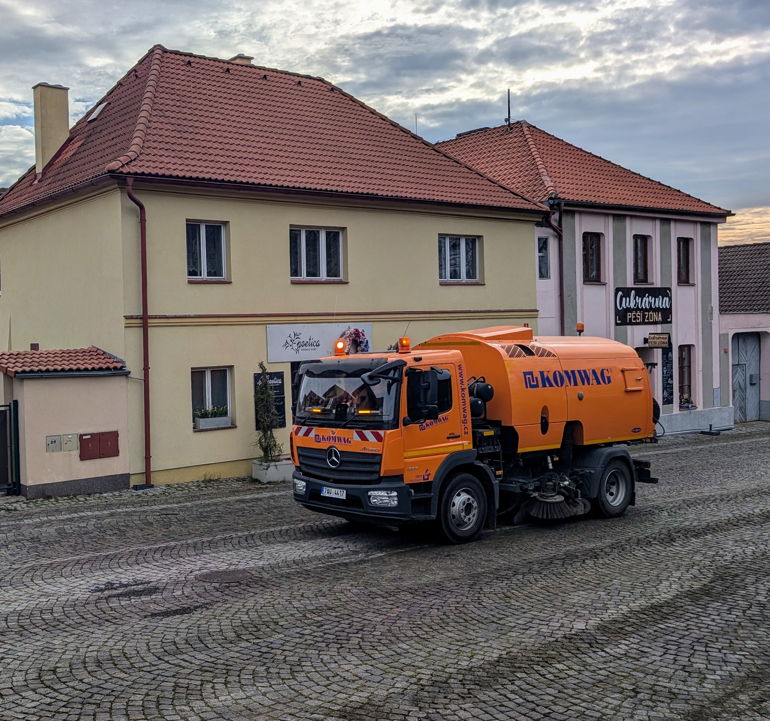 Čistící vůz Komwagu dělá svou práci na Pěší zóně (duben 2025)