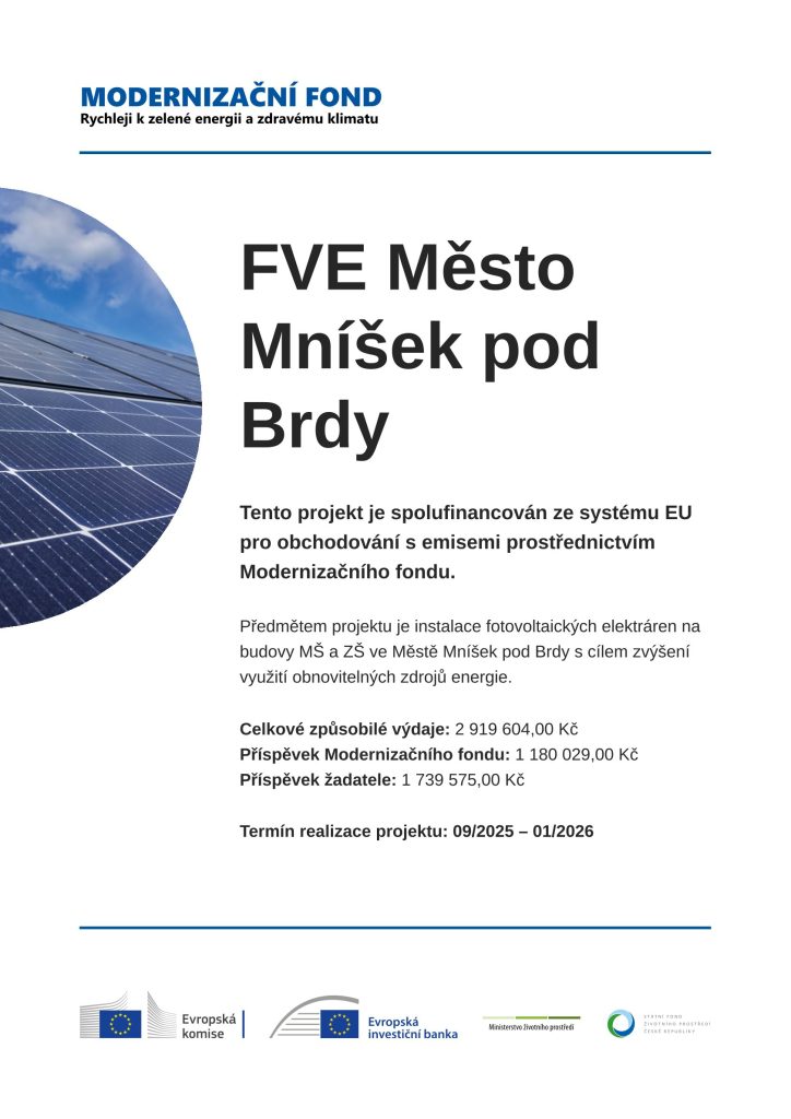 V polovině října by měla být zahájena instalace fotovoltaických elektráren na střechy čtyř městských budov: Pavilon u ZŠ Komenského 420 a Mateřské školy 9. května, Nová a Eden. Solární panely na těchto objektech zvýší využití obnovitelných zdrojů energie a ve výsledku sníží školským organizacím náklady na elektřinu.