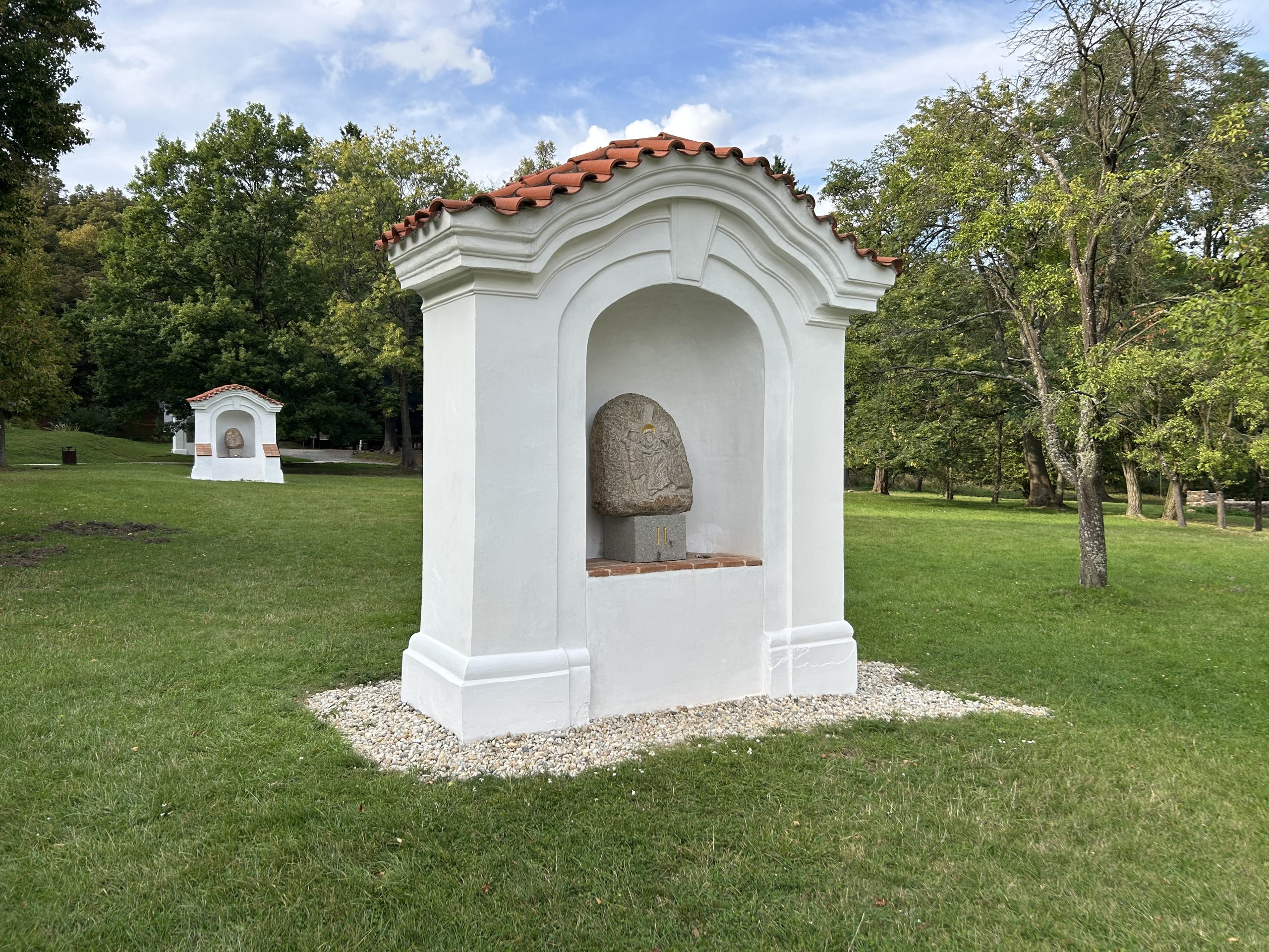 Neznamená to však, že se zcela zastaví degradace omítek a nátěrů, kapličky trpí nepříznivými povětrnostními podmínkami a vzlínáním vlhkosti. To je ale u takových staveb přirozené, a proto je důležité, aby byly používány materiály na vápenné bázi (omítka, štuk a nátěr), které mají vysokou nasákavost vody, které se však umí rychle zbavit. Provedli jsme také očištění prejzových stříšek a opravy rozbitých tašek. Občas totiž na stříšky padají větve z okolních stromů. Cílem je, aby další velká oprava nebyla tak nákladná a kapličky se nedostaly do neutěšeného stavu. Na podobu omítek jsme totiž v dnešní době mnohem citlivější, než byli naši předci.