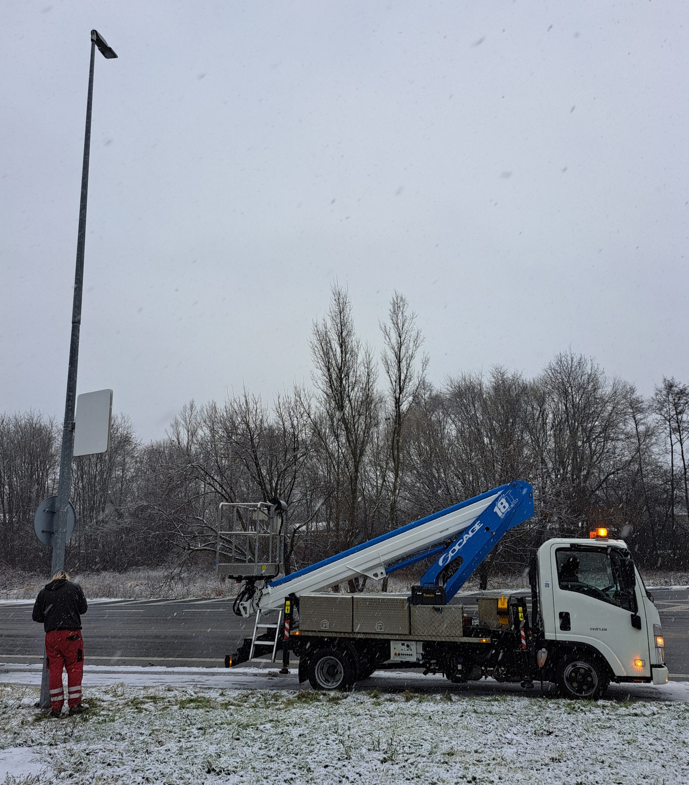 Stožár s novým svítidlem v Pražské ulici (před dálničním mostem)