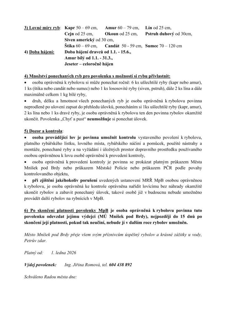 Každý, kdo si koupí místní povolenku, musí dodržovat Místní rybářský řád, který dostane spolu s „Povolenkou“ a „Evidencí docházky a úlovků“. Evidenci docházky a úlovků pak odevzdá do 15 dnů po skončení její platnosti zpět na úřad. Pokud povolenku v uvedeném termínu lovící neodevzdá, nebude mu umožněno zakoupit povolenku na následující rok. Toto je důležité zejména pro přehled, kolik ryb a jaký druh byl vyloven, tudíž které je potřeba opět dokoupit.